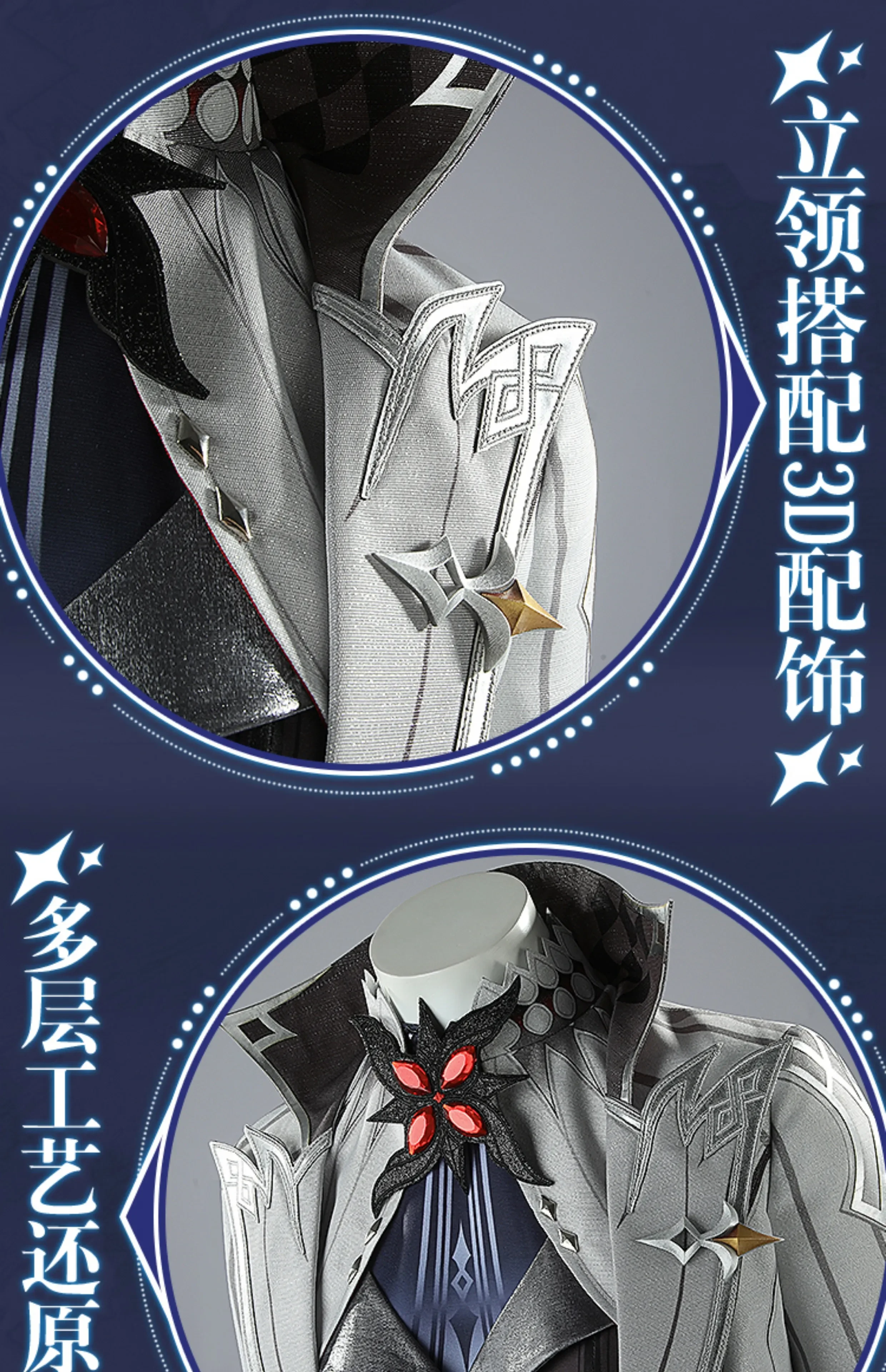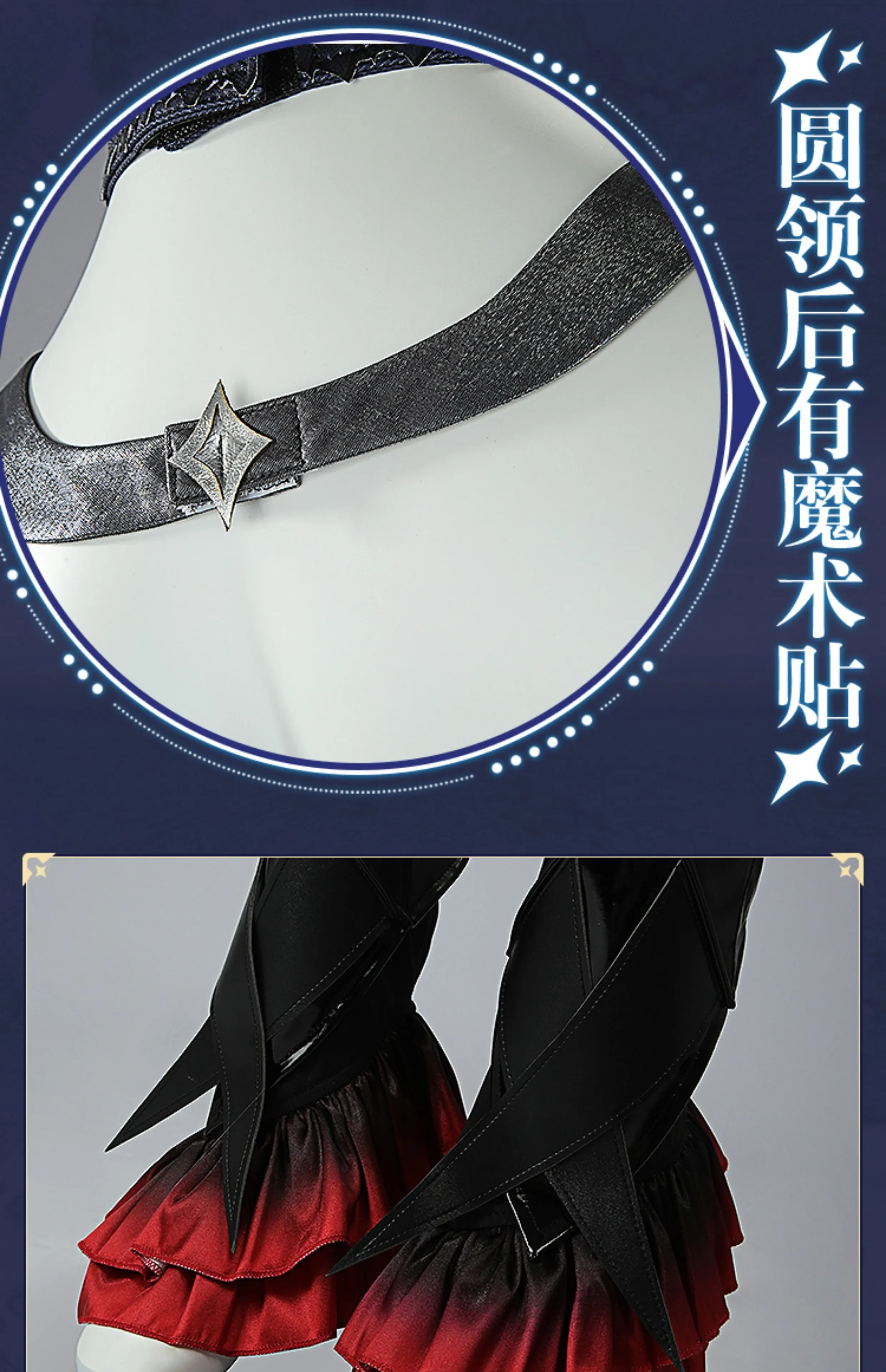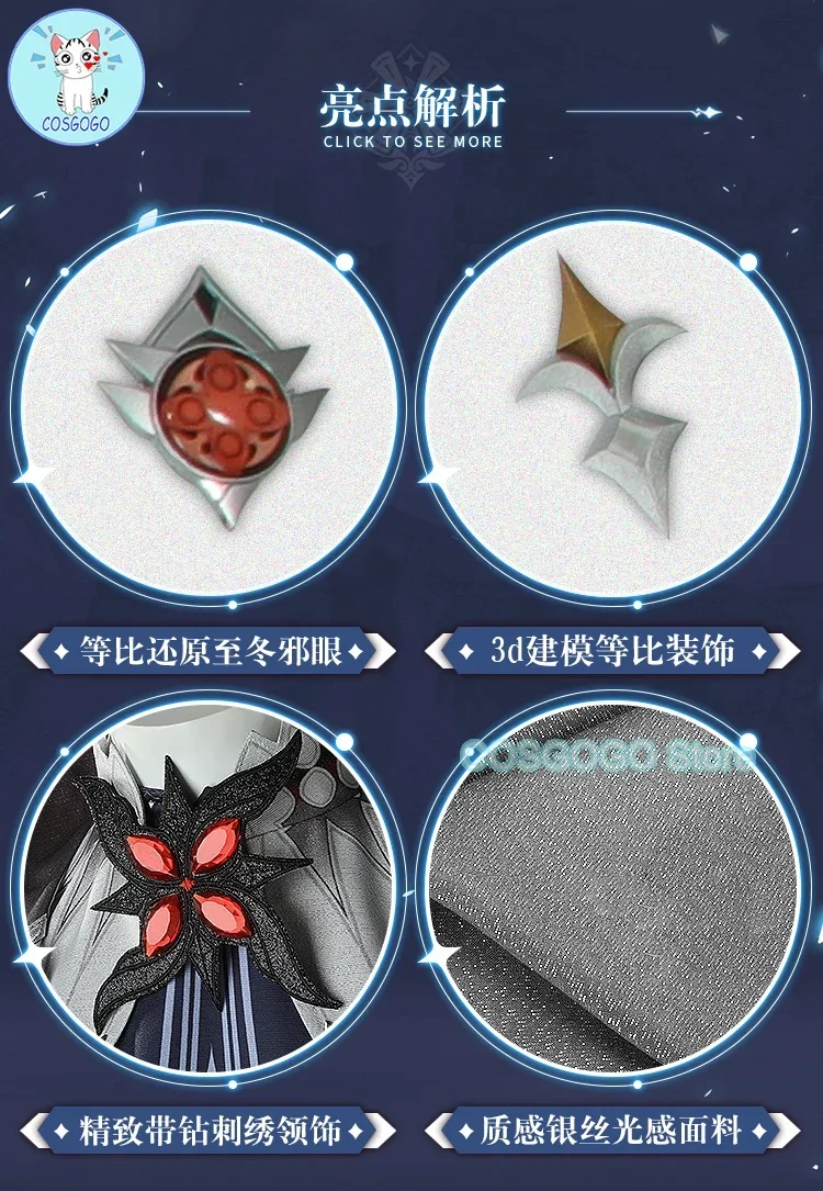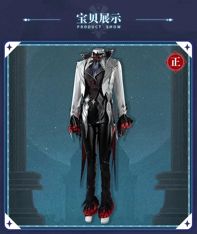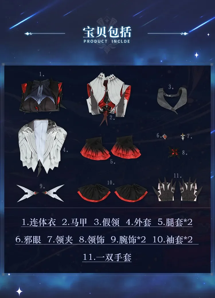 Costume Include:Jumpsuit+vest+fake collar+coat+leg cover *2+ evil eye+collar clip+collar ornament+wrist ornament *2+ cuff *2+ a pair of gloves.