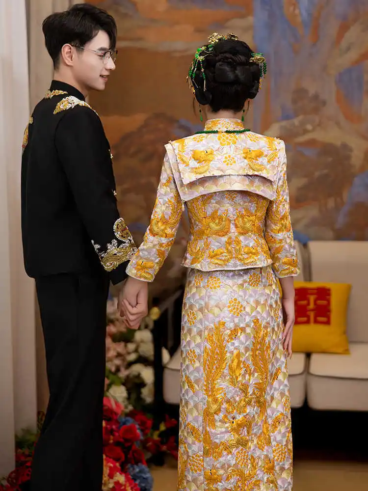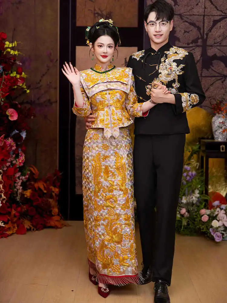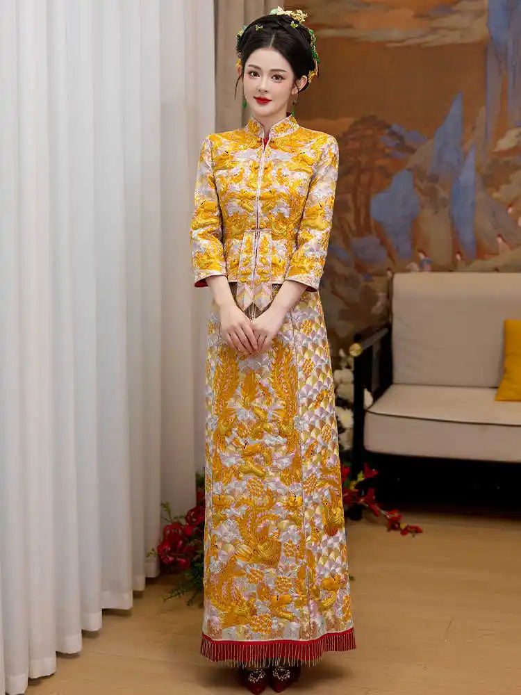 Be the first to review “Gold Qipao Hanfu Dress Bride Ancient Costume Chinese Wedding Dress Traditional Embroidery Toast Clothing Vestido”