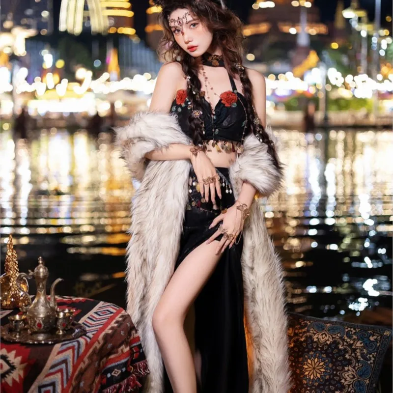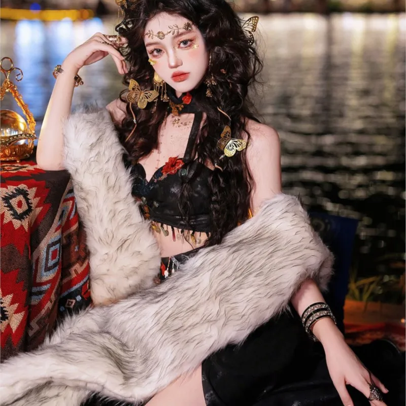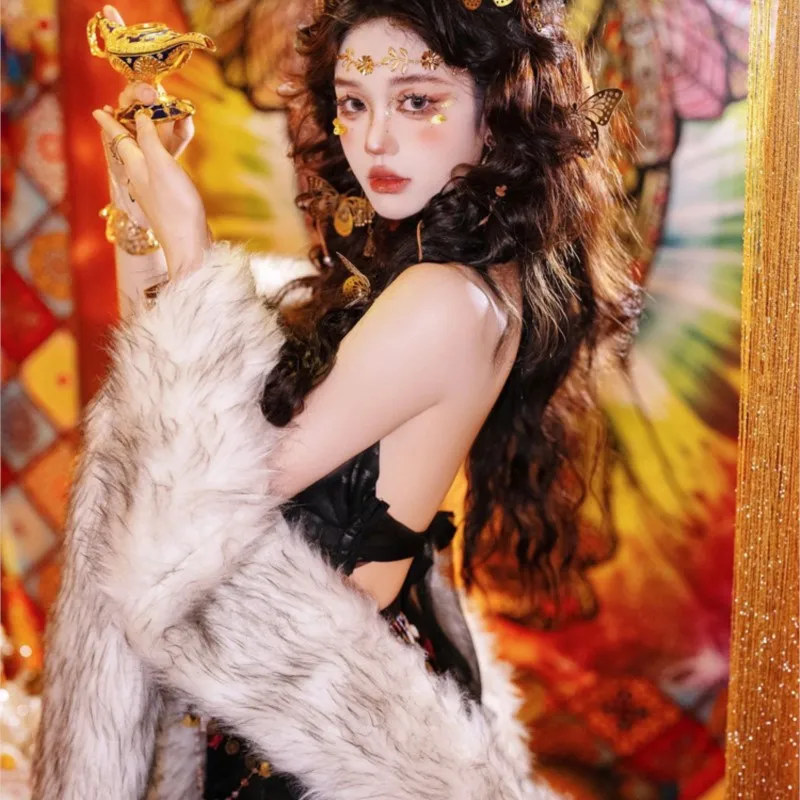 Picture color set consists of: Forehead + gold finger chain + fur cape + black dress.