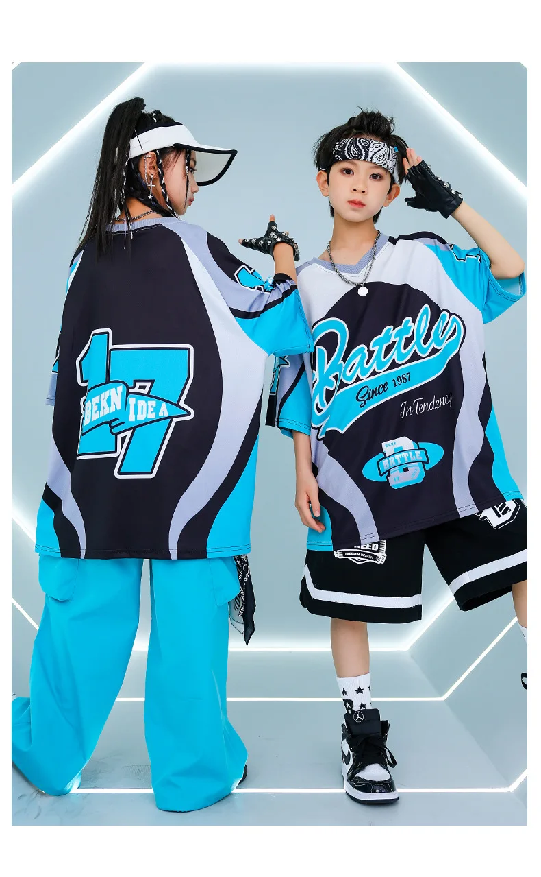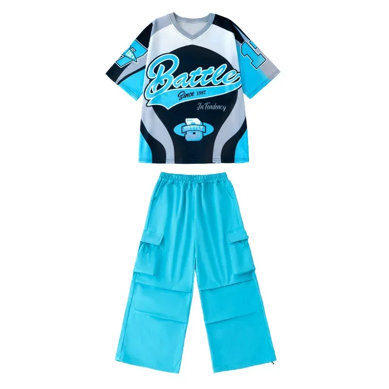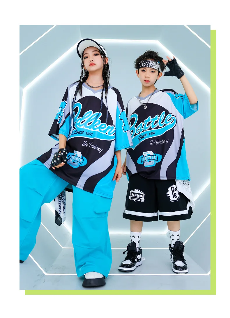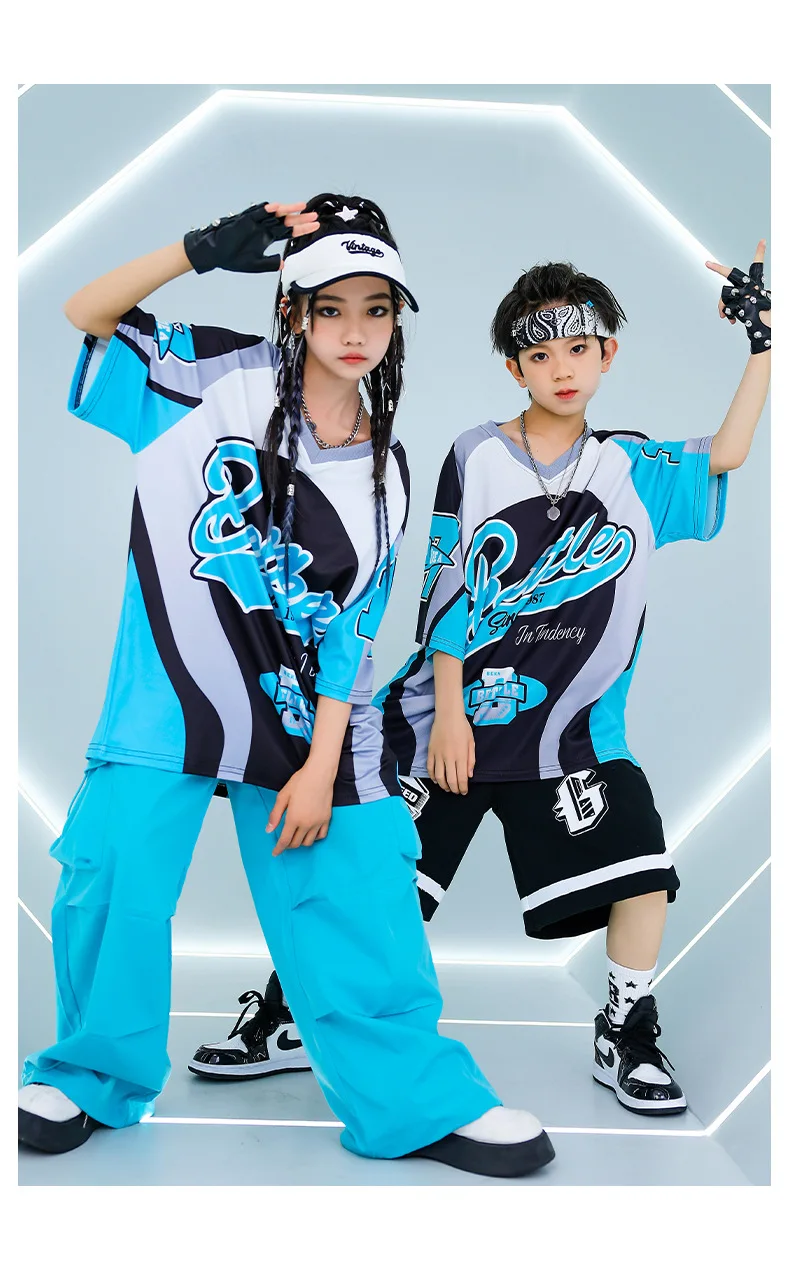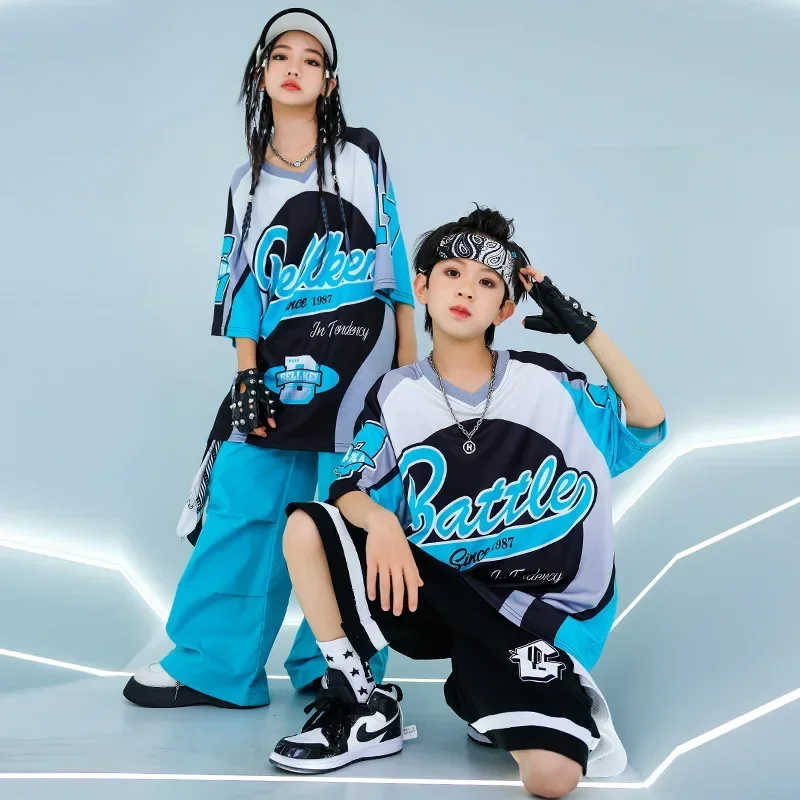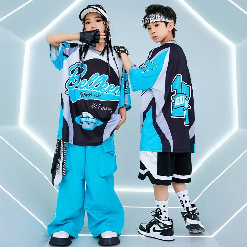 New Summer Teens Loose Blue T-Shirt Pants Black Shorts Boys Hip Hop Outfits Modern Jazz Dance Costume Girl Kpop Performance Wear