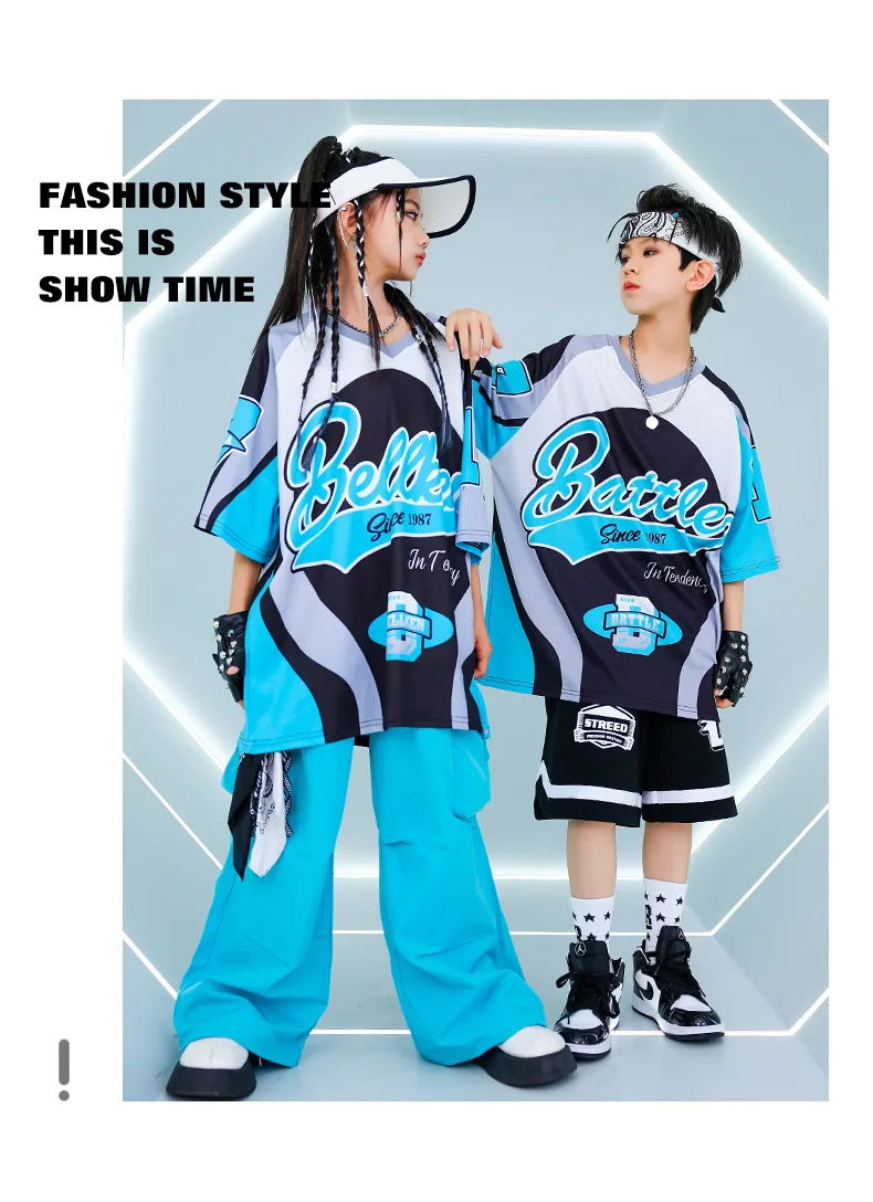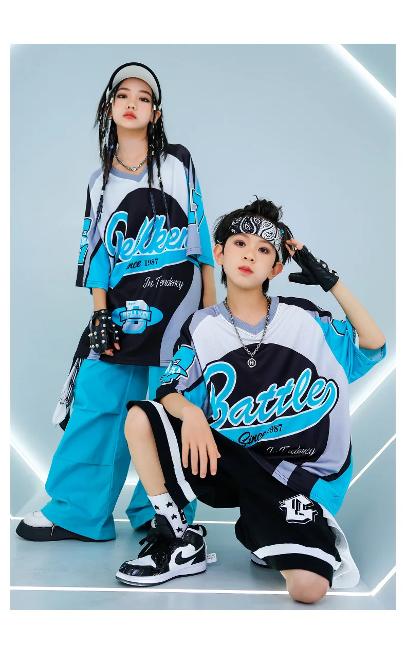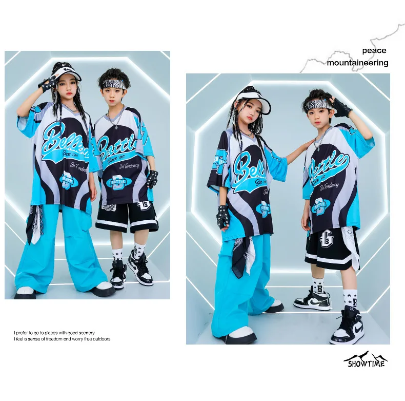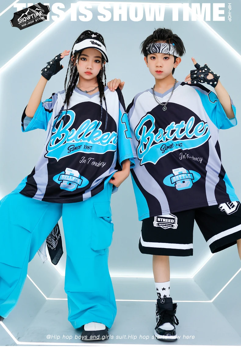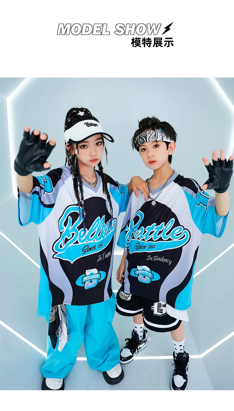 New Summer Teens Loose Blue T-Shirt Pants Black Shorts Boys Hip Hop Outfits Modern Jazz Dance Costume Girl Kpop Performance Wear