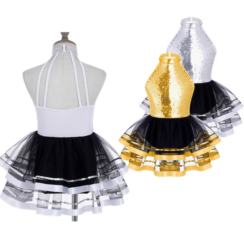 Jazz Dance Costume Kids Halter Shiny Sequins Gymnastics Unitards Dress Girls Ballet Leotard Stage Performance Clothing Hollow Back Tutu Mesh Dance Dress