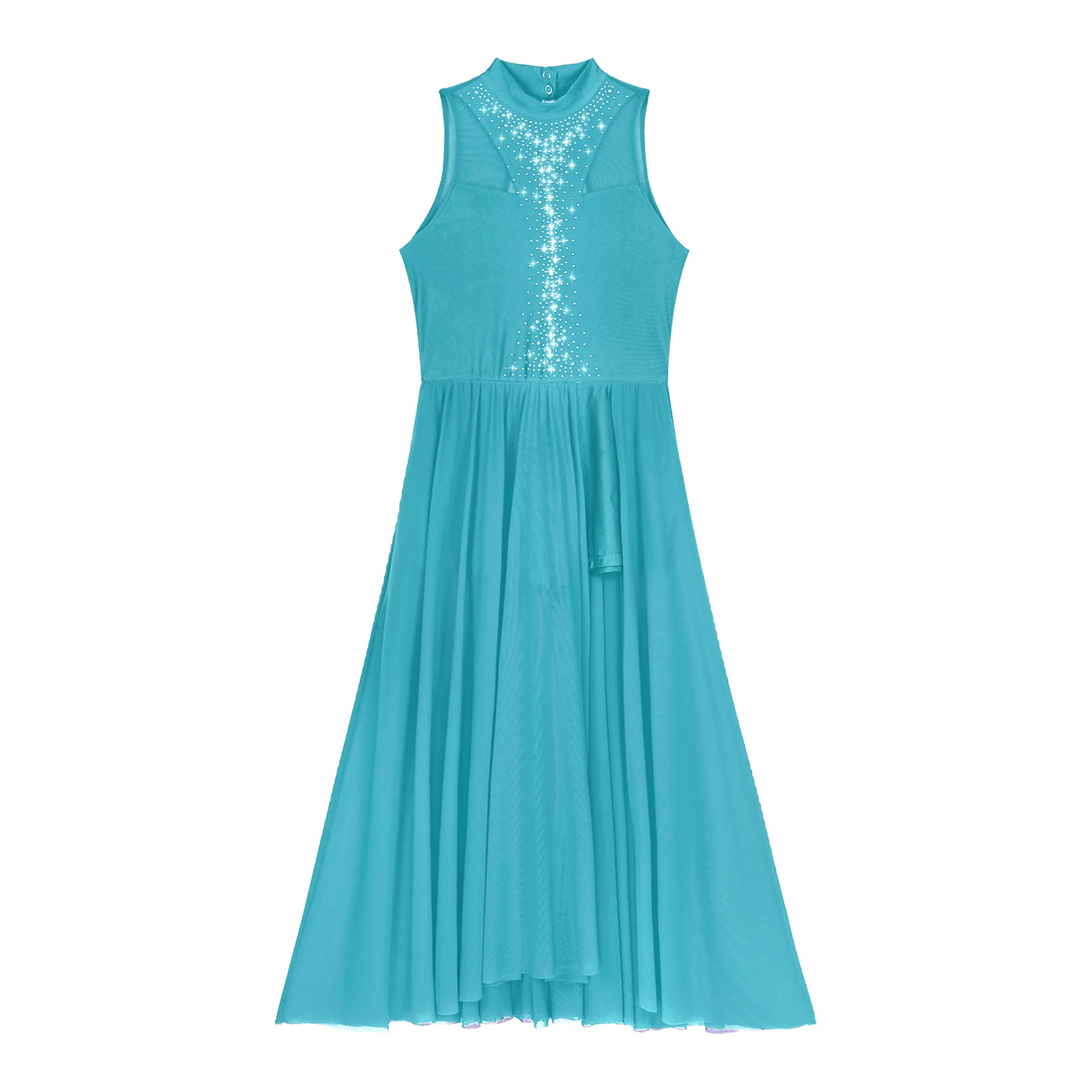 Sleeveless dance dress, mock neck with press buttons closure, back keyhole design.